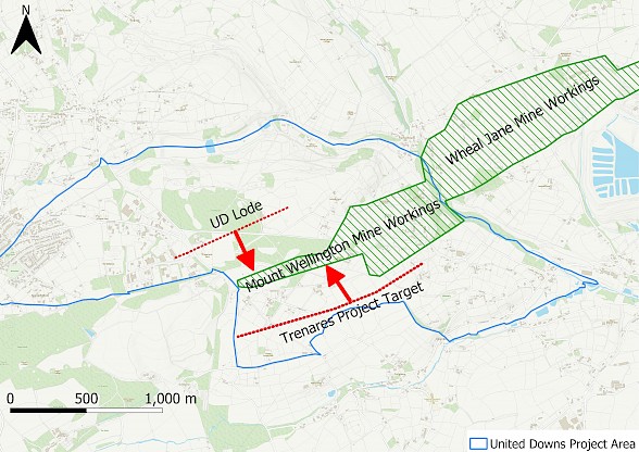 Cornish Metals Inc. (TSX-V/AIM: CUSN) (“Cornish Metals” or the “Company”) reports that it has added a second drill rig to its ongoing 8,000 metre (“m”) – 9,000m drill programme at United Downs, Cornwall, UK. The second rig will explore Trenares Lode, a new target located approximately 900m south of UD Lode where drilling is continuing (see map below). The most recent details on the status of drilling at the UD lode were provided in Cornish Metals’ news release dated August 30, 2021.