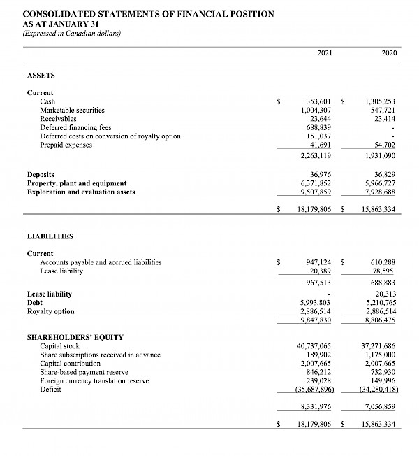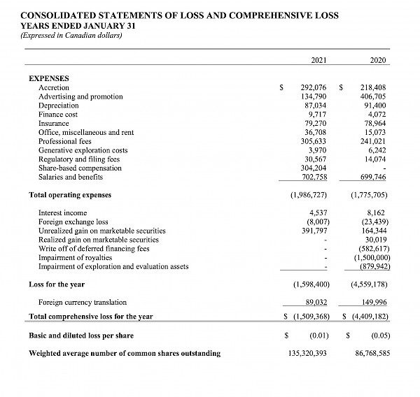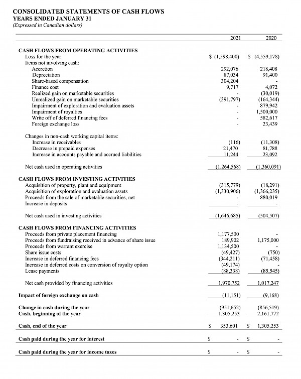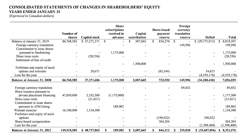 - Exercise of 16,100,000 warrants during the year ended January 31, 2021, of which 5,222,222 were under an early warrant exercise incentive program, for proceeds of $1,134,500;