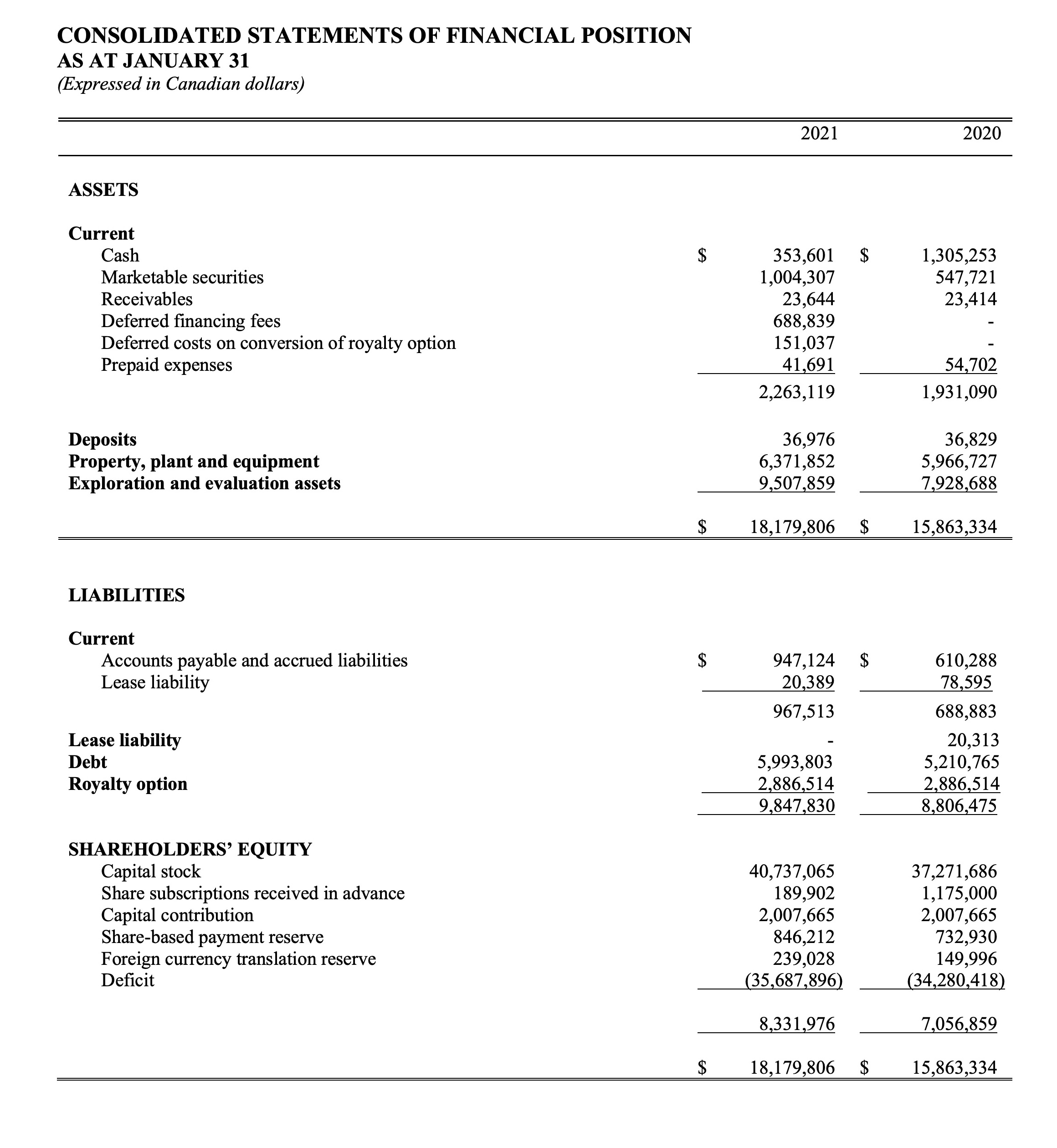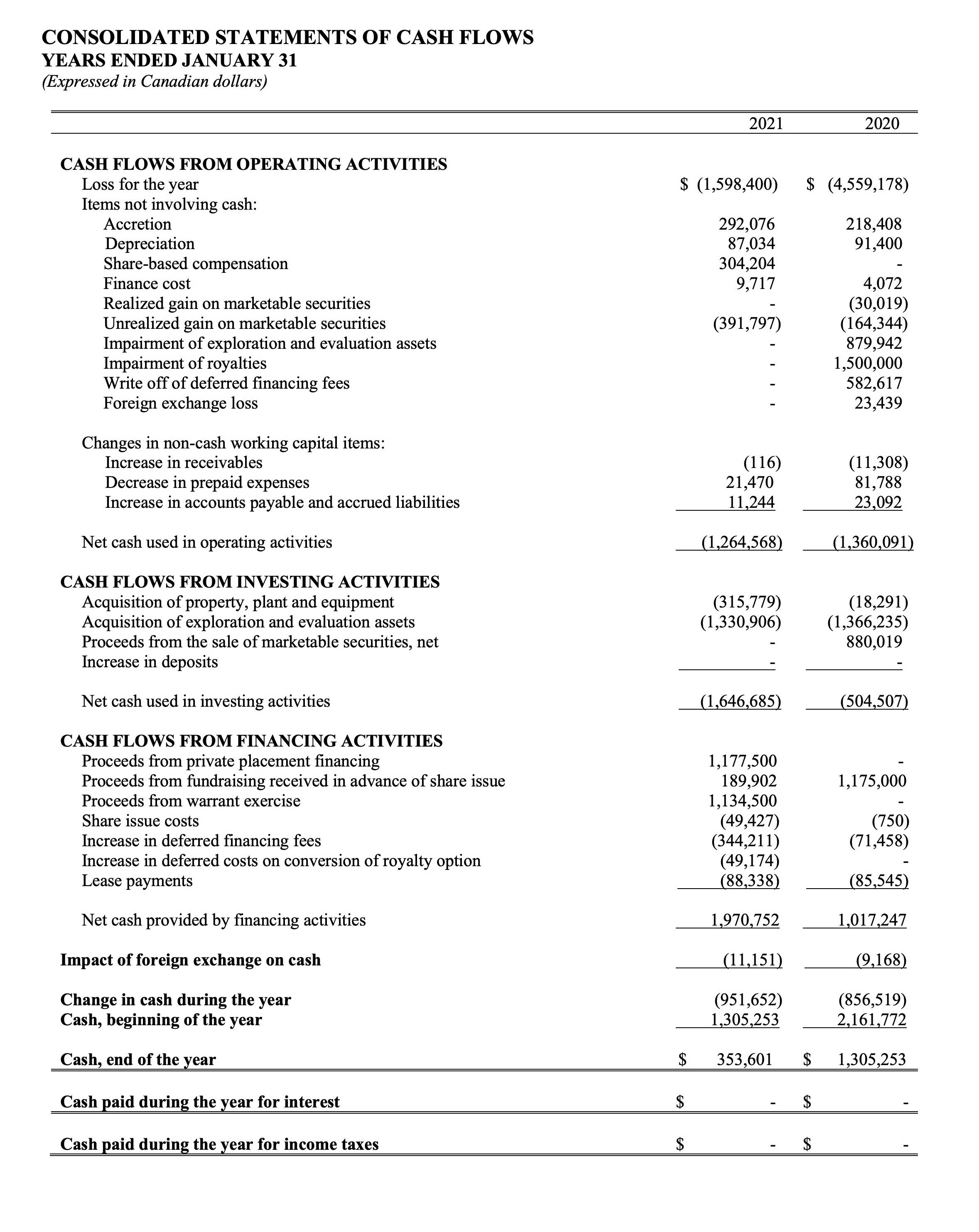 - Exercise of 16,100,000 warrants during the year ended January 31, 2021, of which 5,222,222 were under an early warrant exercise incentive program, for proceeds of $1,134,500;