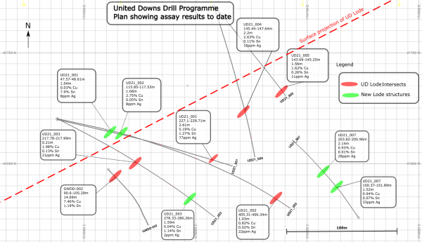 Richard Williams, CEO, stated “Drilling at United Downs has successfully demonstrated the continuity of UD Lode along strike over a 200m distance, and highlights the potential to discover new zones of copper – tin – silver mineralisation adjacent to the main target. Drilling is ongoing to fully determine the lateral and vertical extent of these zones of mineralisation.”