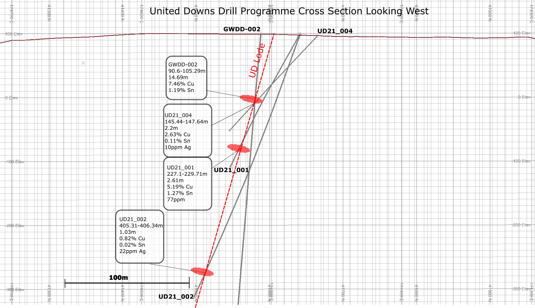 Richard Williams, CEO, stated “Drilling at United Downs has successfully demonstrated the continuity of UD Lode along strike over a 200m distance, and highlights the potential to discover new zones of copper – tin – silver mineralisation adjacent to the main target. Drilling is ongoing to fully determine the lateral and vertical extent of these zones of mineralisation.”