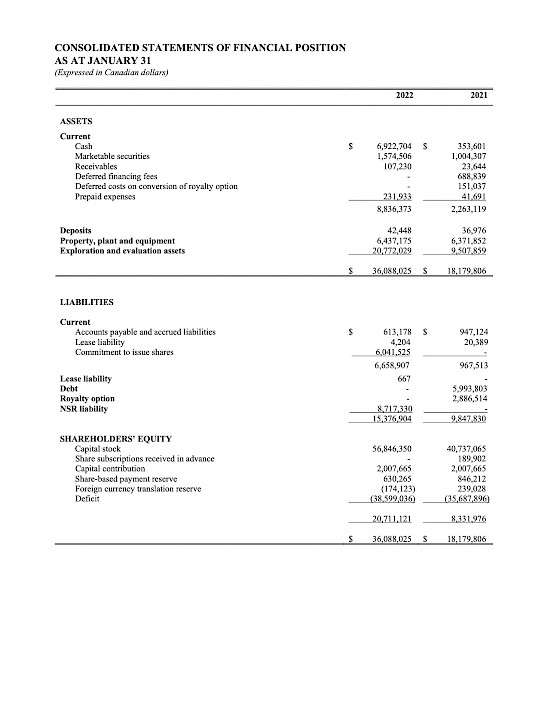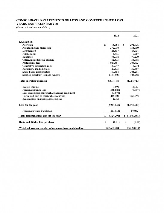 Highlights for the year ended January 31, 2022 and for the period ending May 17, 2022