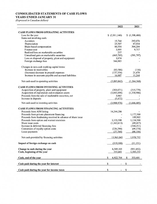 - Unrealized gain of $445,703 arising from increased valuation of Company’s holding in Cornish Lithium based on allotment price following its fundraising completed in December 2021;