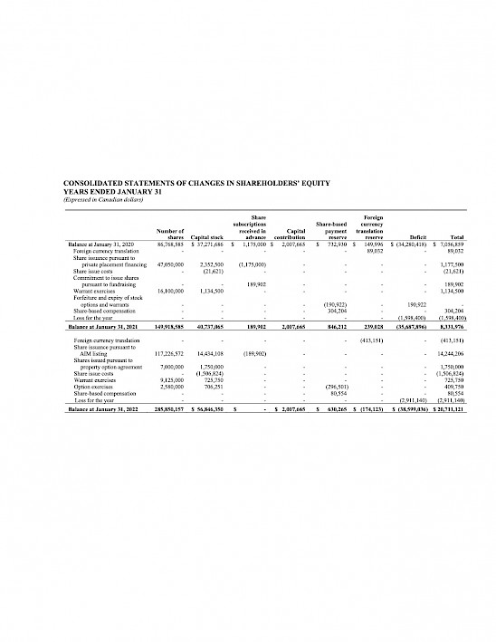 - the issuance of 7,000,000 common shares to the Sellers (“Closing Shares”) immediately upon receipt of shareholder and applicable regulatory approval (issued October 29, 2021 at a value of $1,750,000 in accordance with IFRS pursuant to the satisfaction of this commitment);