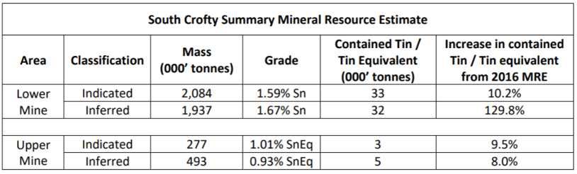 An updated MRE for South Crofty mine was released on June 9, 2021 which showed a 10.2% increase in Indicated Mineral Resource to 2.08 million tonnes, grading 1.59% tin, and a 129.8% increase in Inferred Mineral Resource to 1.94 million tonnes, grading 1.67% tin. These figures are for the Lower Mine and are prepared in accordance with the JORC Code (2012).