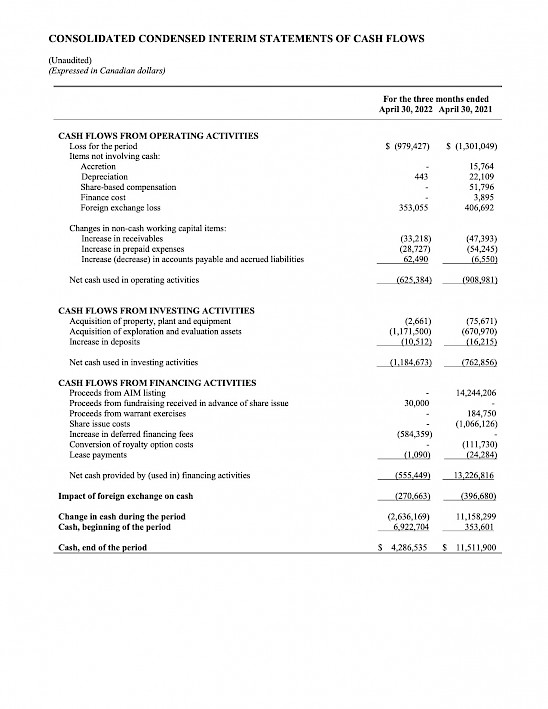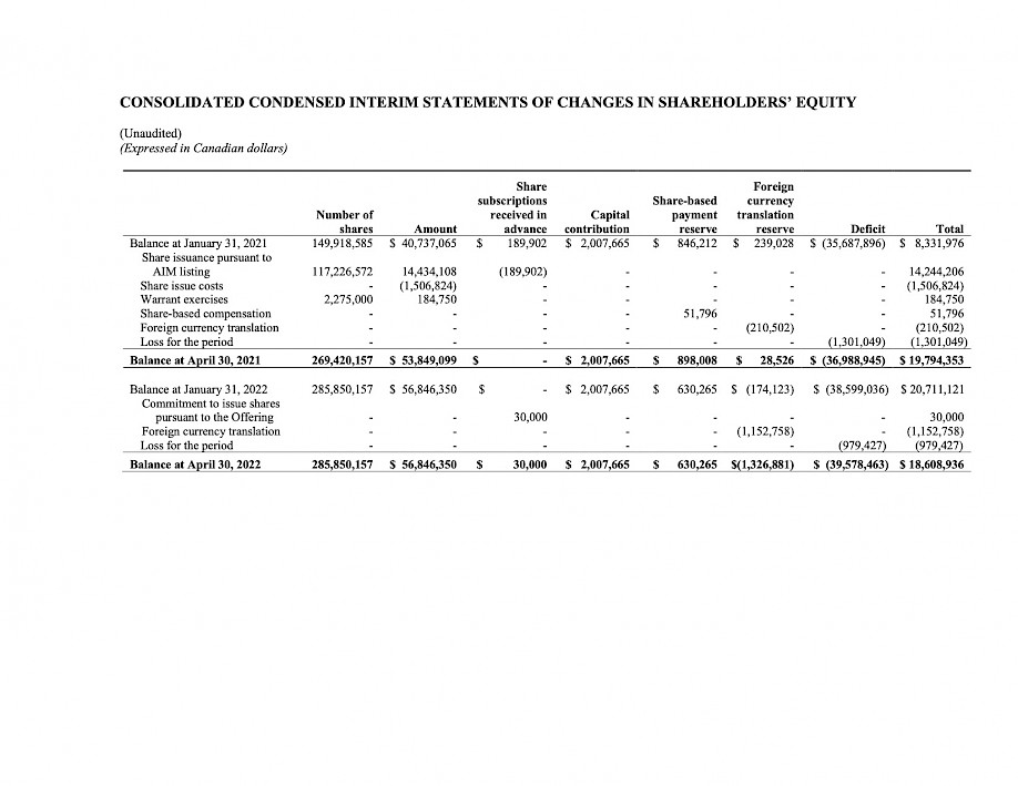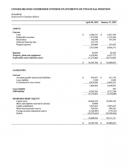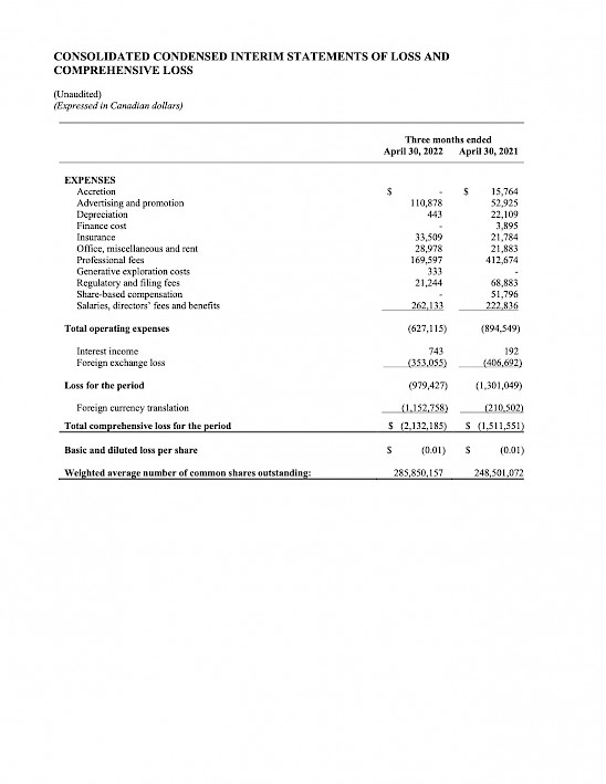 Highlights for the three months ended April 30, 2022 and for the period ending June 22, 2022