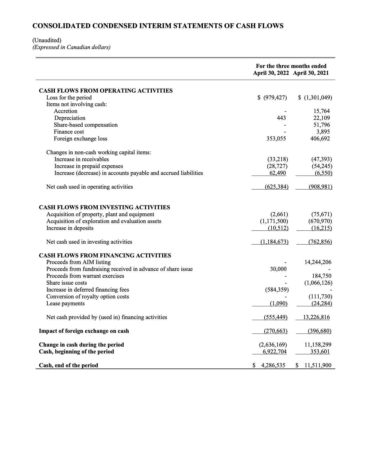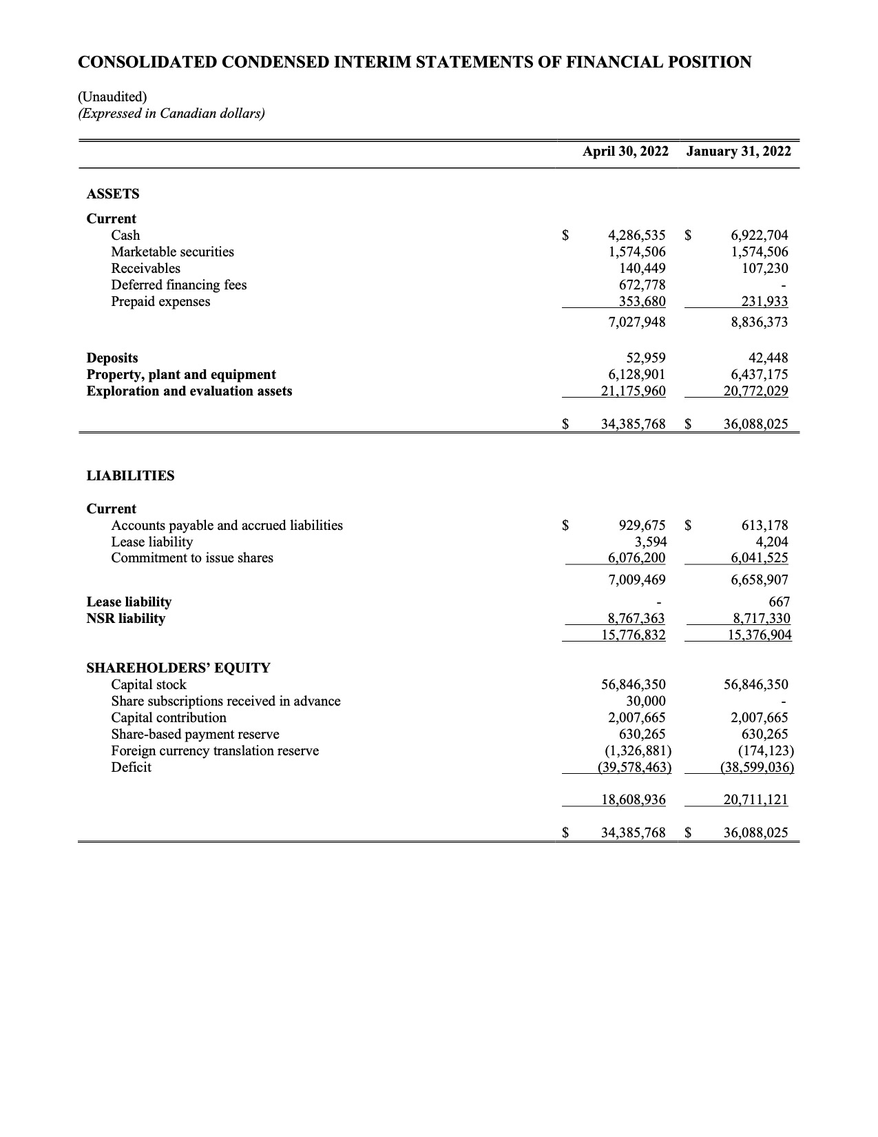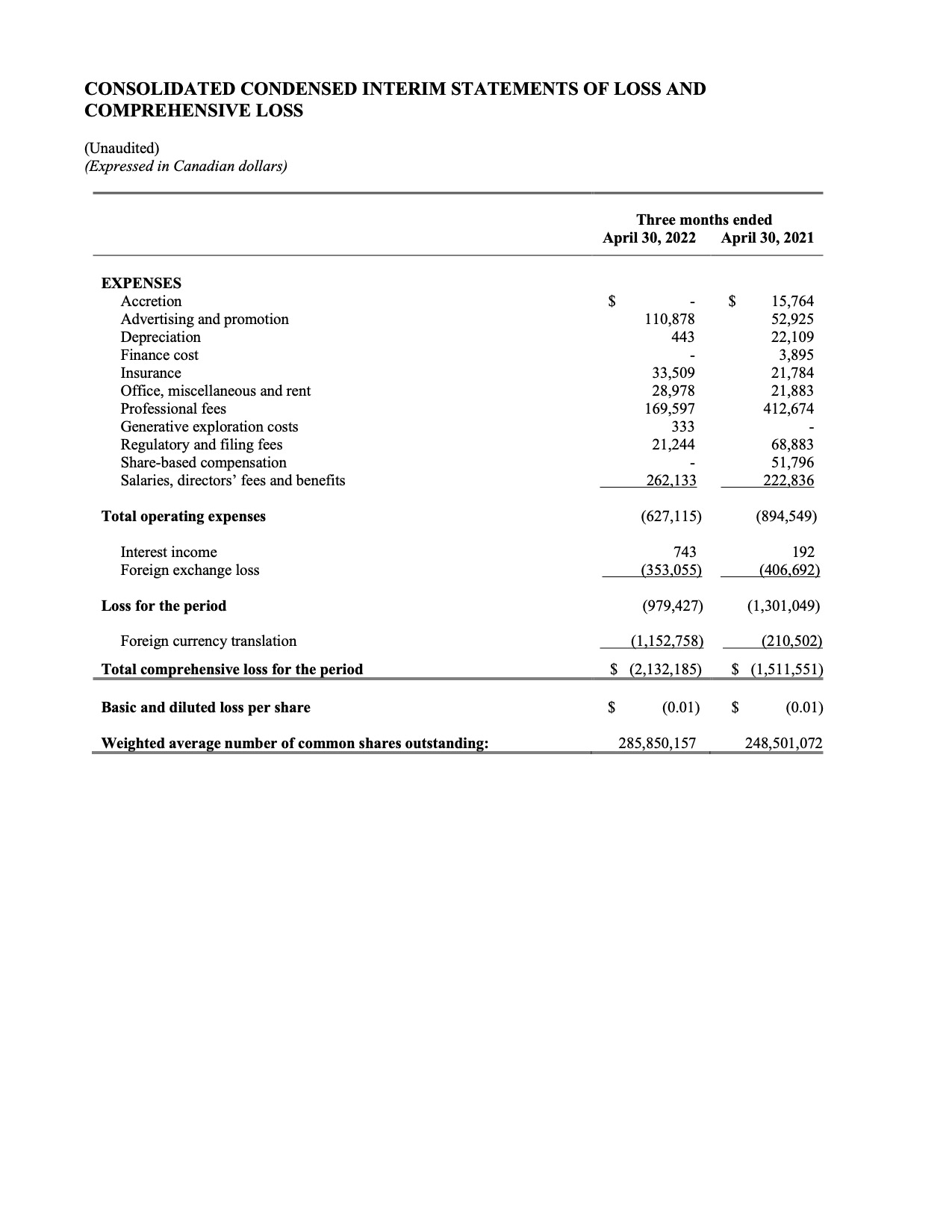 Highlights for the three months ended April 30, 2022 and for the period ending June 22, 2022