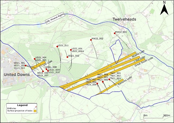 - Two drill holes (UD22_01 and UD22_01A), totaling 1010.61m, drilled in the central part of United Downs project, tested the down dip extension of United Mines (Figure 2).
