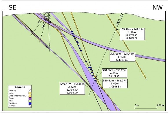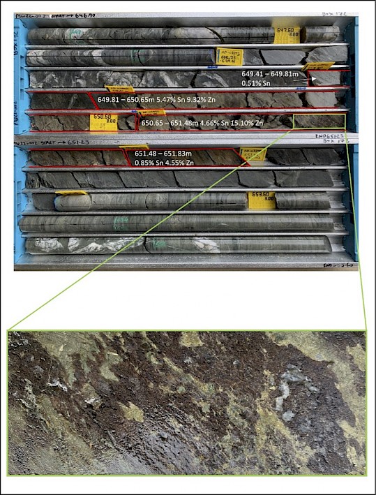 - 2.42m grading 3.70% tin, and 9.09% zinc from 649.41m.