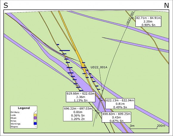 - High grade tin intersects were encountered in UD22_01 and UD22_01A, confirming a potential transition from high grade copper to high grade tin at depth, similar to the mineralisation transition seen at South Crofty Mine (Figure 5).