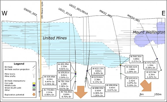 Figure 6 – Long Section of copper, tin and zinc lode intersections down dip from the historic United Mines and Mount Wellington Mine, drilled during the Cornish Metals 2021/2022 United Downs exploration programme
