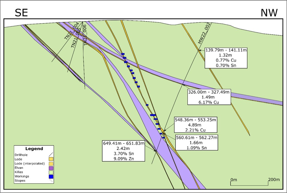 - High grade tin intersects were encountered in UD22_01 and UD22_01A, confirming a potential transition from high grade copper to high grade tin at depth, similar to the mineralisation transition seen at South Crofty Mine (Figure 5).
