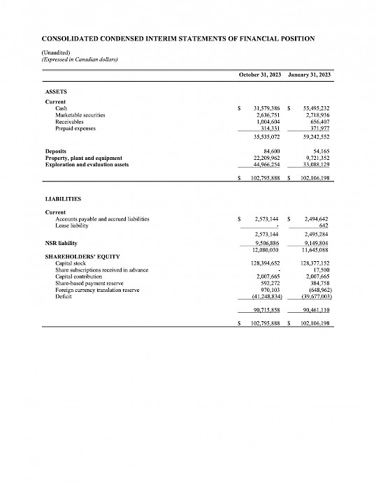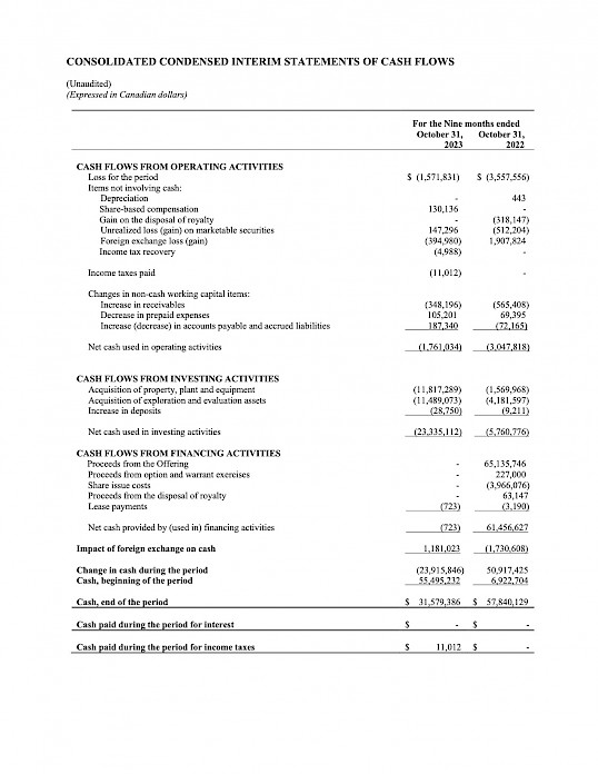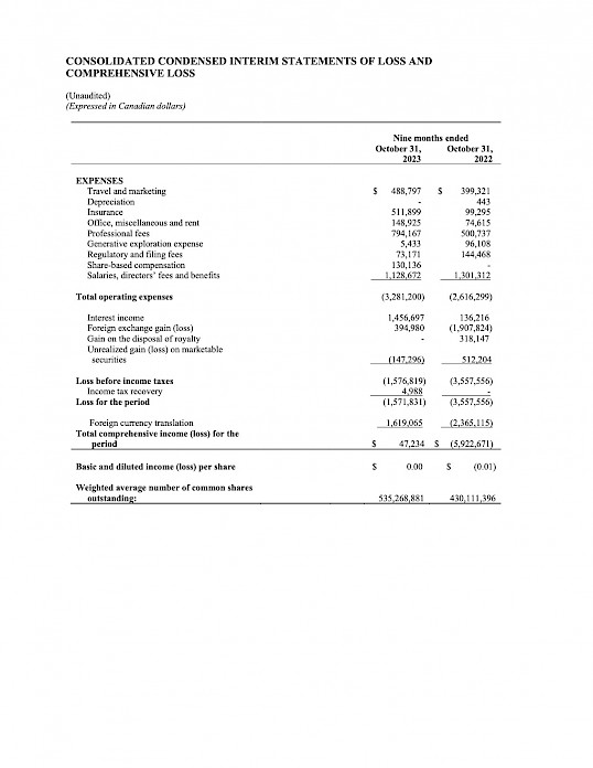 Highlights for the nine months ended October 31, 2023 and for the period ending December 13, 2023