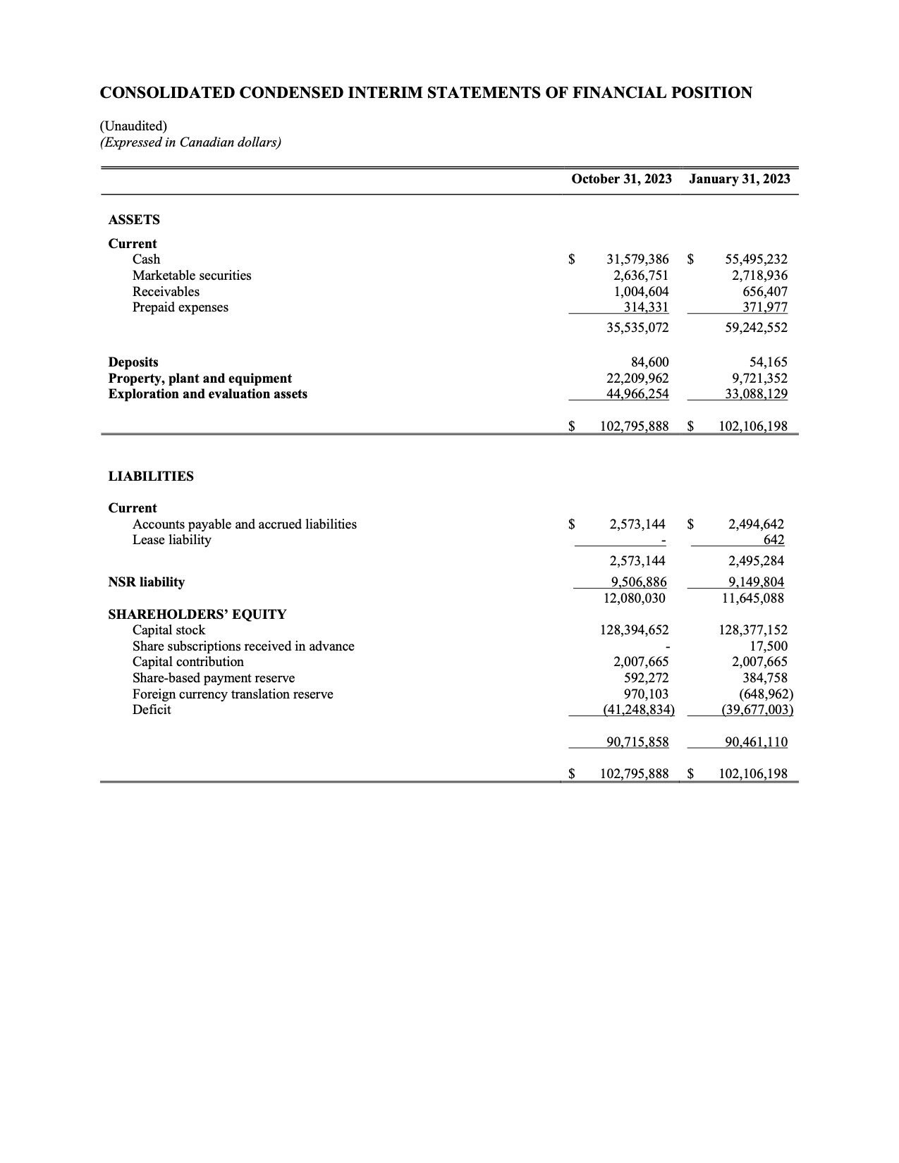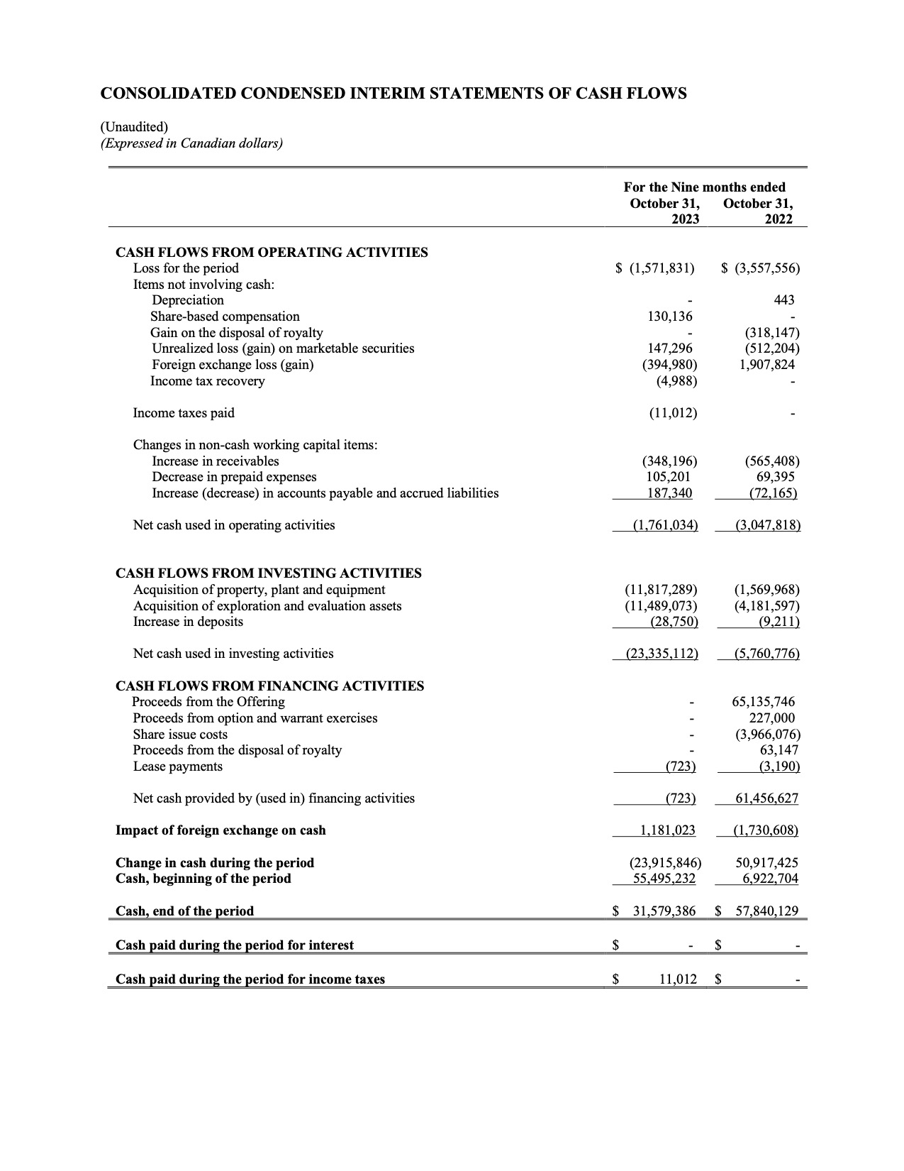 Highlights for the nine months ended October 31, 2023 and for the period ending December 13, 2023
