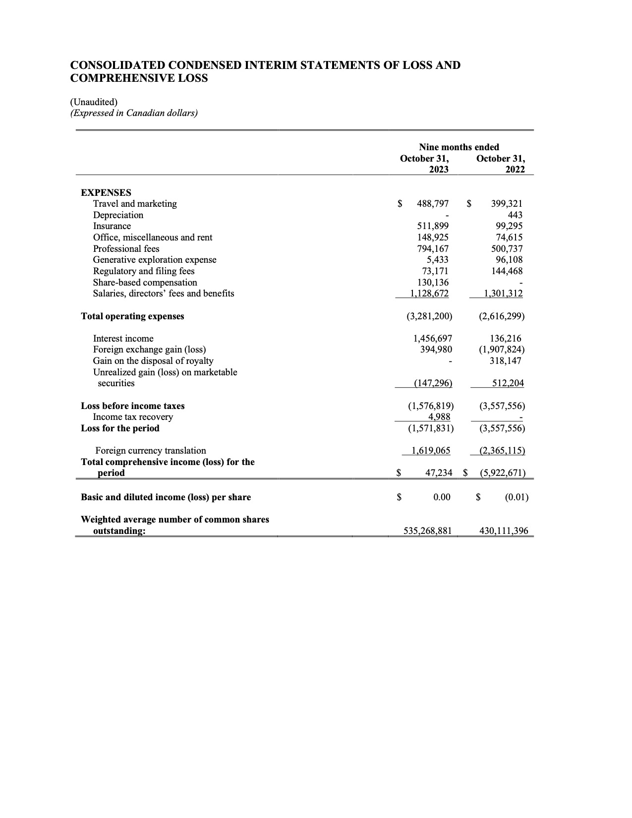 Financial highlights for the nine months ended October 31, 2023 and October 31, 2022